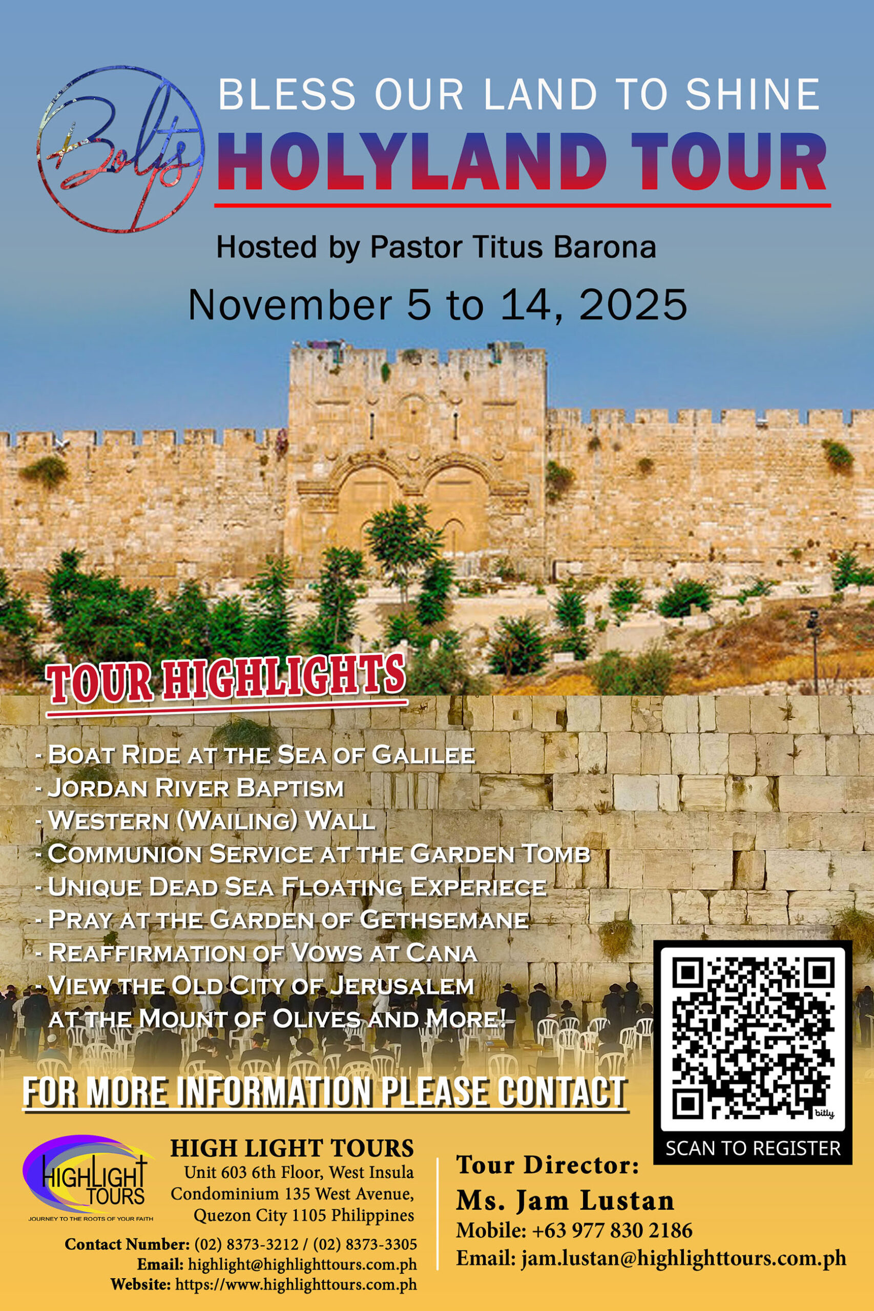 Experience the wonders of the Holy Land on the Israel Pilgrimage Tour 2025, led by Pastor Titus Barona. From November 05-14, 2025, immerse yourself in the rich history, sacred sites, and spiritual significance of Israel.